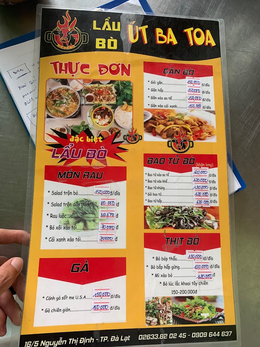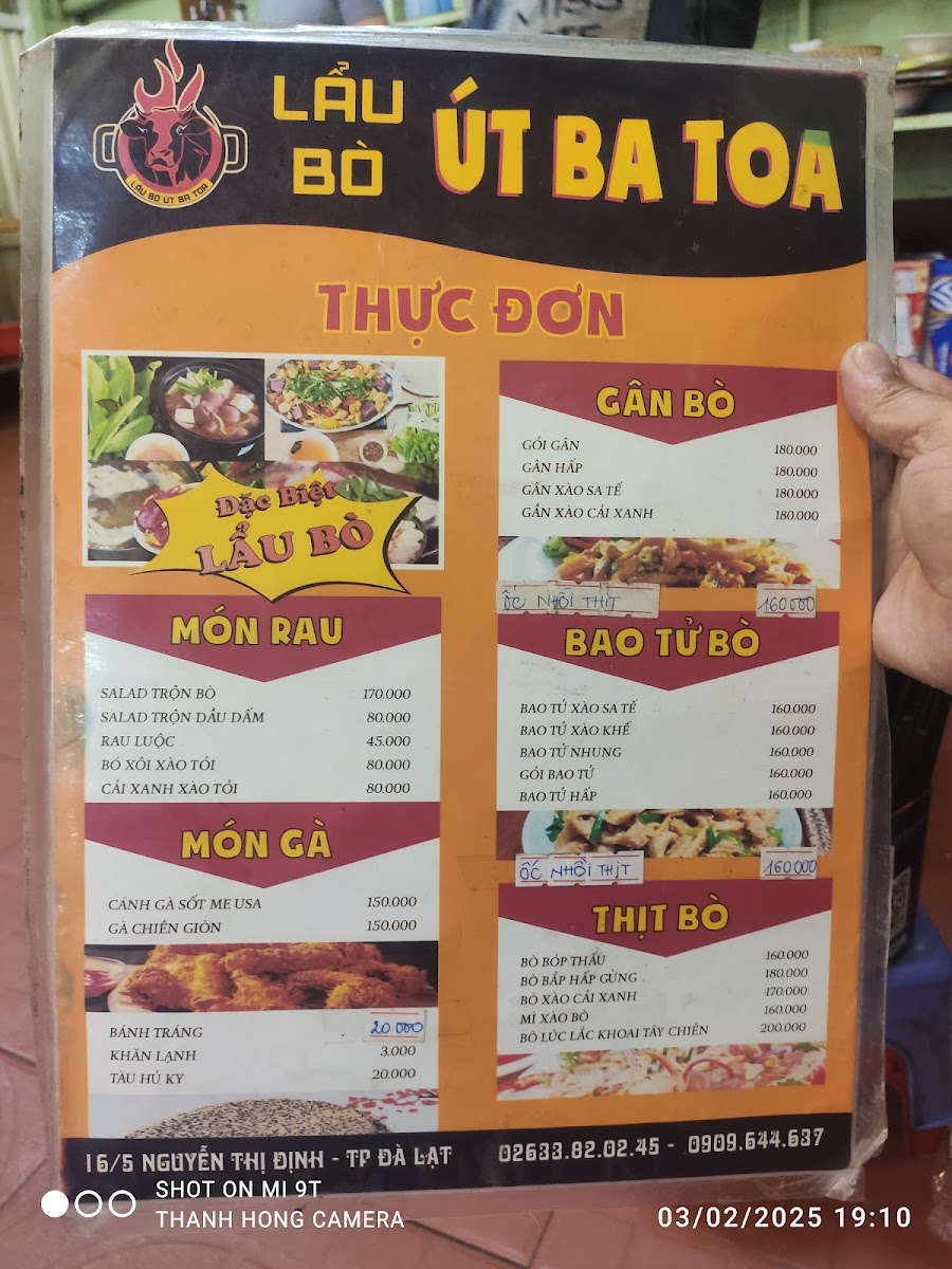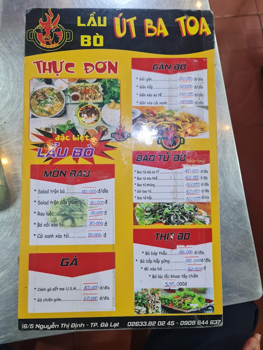 If you’re in Đà Lạt and craving something hearty and flavorful, the Lẩu Bò Út Ba Toa Menu has just what you need. Located at 16/5 Nguyễn Thị Định, Phường 5, Lâm Đồng, this spot is a local favorite for its delicious take on the classic Vietnamese hot pot. The menu features a variety of rich, aromatic broths paired with tender beef, fresh vegetables, and an array of dipping sauces that bring out the true essence of Vietnamese comfort food. Whether you're a regular or a first-timer, there’s something here to satisfy every craving. From the savory beef cuts to the perfect balance of herbs and spices, each dish is crafted to give you a unique and satisfying dining experience. If you find yourself in the area, this is definitely a spot you don’t want to miss!
